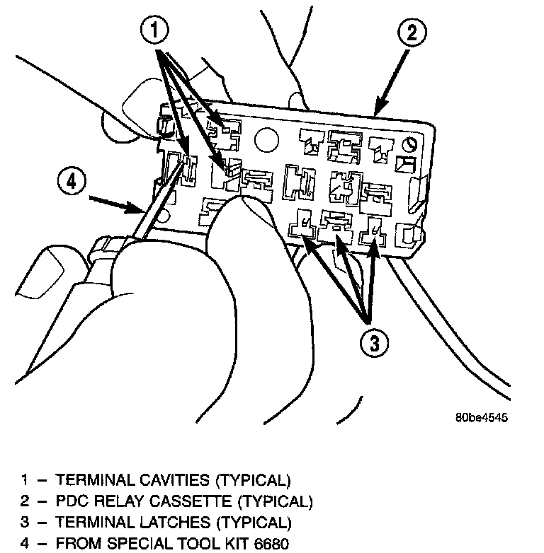 CAUTION: Proper care must be taken to be certain that the wiring and terminals from the faulty PDC relay cassette are installed in the correct terminal cavities of the replacement relay cassette. To prevent mistakes it is recommended that the wiring and terminals be removed from the faulty relay cassette one cavity at a time, repaired or spliced as necessary, then installed securely into the correct cavity of the replacement relay cassette.