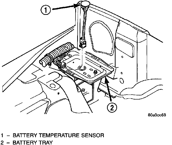 The Battery Temperature Sensor is located under the vehicle battery and is attached to a mounting hole on battery tray.