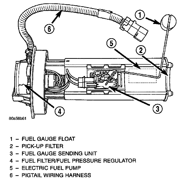 The fuel gauge sending unit (fuel level sensor) and float assembly is located on the side of fuel pump module. The fuel pump module is located within the fuel tank.