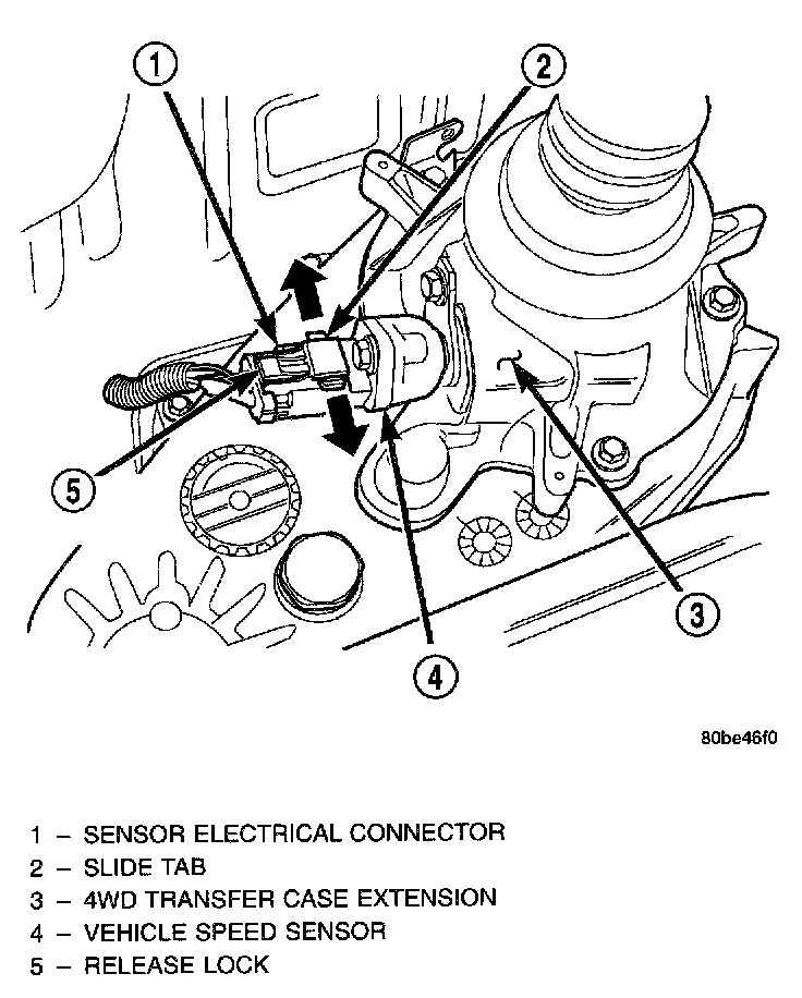 The Vehicle Speed Sensor (VSS) is located on the speedometer pinion gear adapter. If equipped with 4WD, this adapter is located on the transfer case extension (left side). If equipped with 2WD, this adapter is located on the extension housing of the transmission (left side).