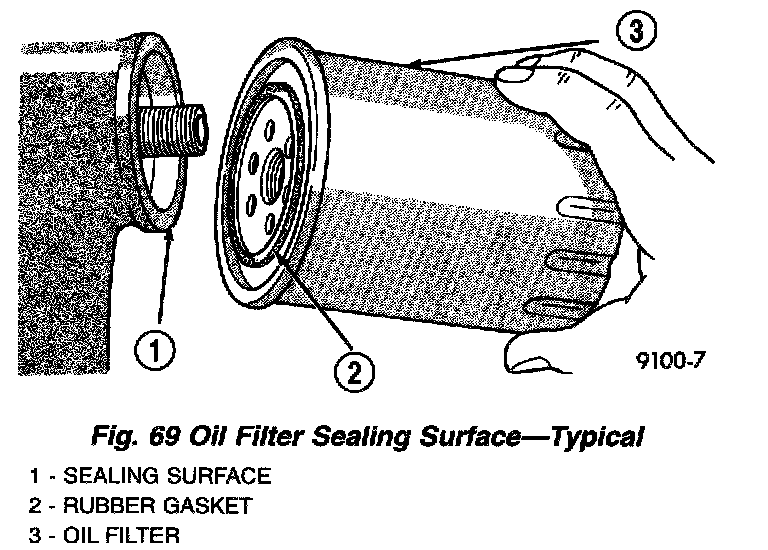 11. Make sure old gasket comes off with oil filter. With a wiping cloth, clean the gasket sealing surface (Fig. 69) of oil and grime.