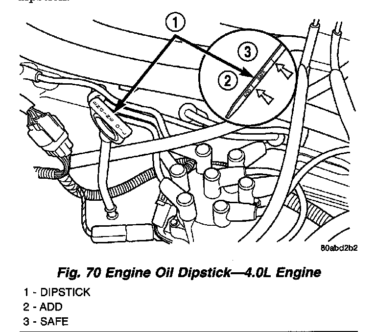 The acceptable levels are indicated between the ADD and SAFE marks on the engine oil dipstick (Fig. 70).