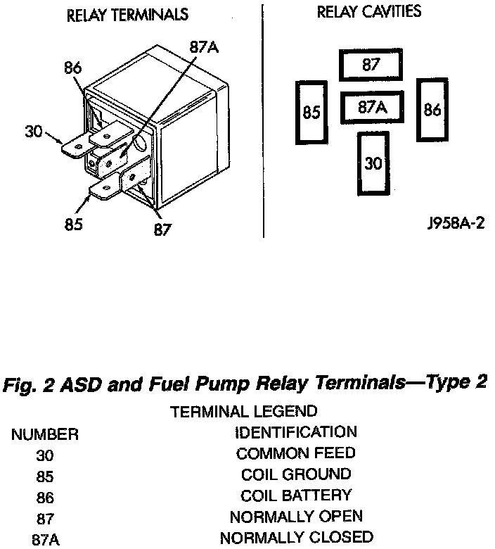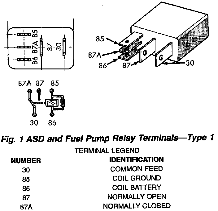 The following description of operation and tests apply only to the Automatic Shutdown (ASD) and fuel pump relays. The terminals on the bottom of each relay are numbered. Two different types of relays may be used, or.