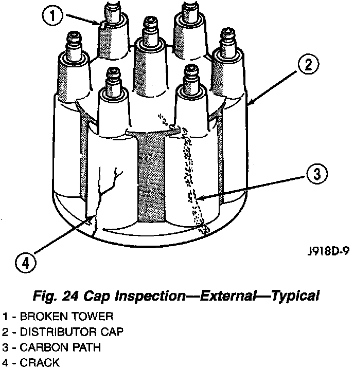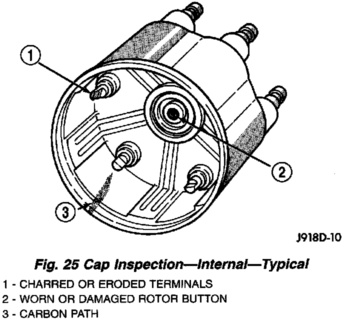 Remove the distributor cap and wipe it clean with a dry lint free cloth. Visually inspect the cap for cracks, carbon paths, broken towers or damaged rotor button. Also check for white deposits on the inside (caused by condensation entering the cap through cracks). Replace any cap that displays charred or eroded terminals. The machined surface of a terminal end (faces toward rotor) will indicate some evidence of erosion from normal operation. Examine the terminal ends for evidence of mechanical interference with the rotor tip.