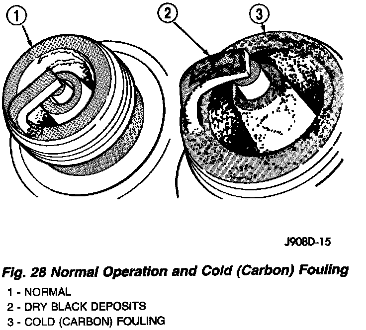 Cold fouling is sometimes referred to as carbon fouling. The deposits that cause cold fouling are basically carbon. A dry, black deposit on one or two plugs in a set may be caused by sticking valves or defective spark plug cables. Cold (carbon) fouling of the entire set of spark plugs may be caused by a clogged air cleaner element or repeated short operating times (short trips).