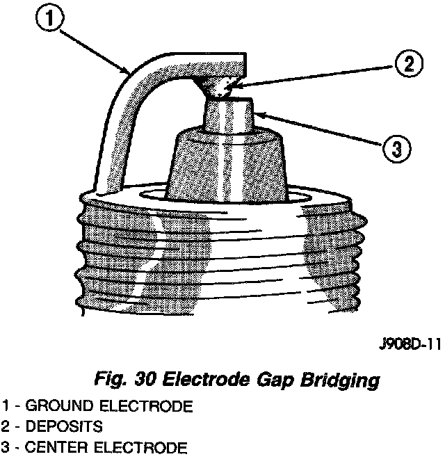 Electrode gap bridging may be traced to loose deposits in the combustion chamber. These deposits accumulate on the spark plugs during continuous stop-and-go driving. When the engine is suddenly subjected to a high torque load, deposits partially liquefy and bridge the gap between electrodes. This short circuits the electrodes. Spark plugs with electrode gap bridging can be cleaned using standard procedures.