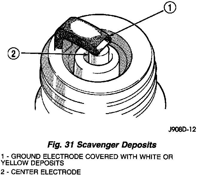 Fuel scavenger deposits may be either white or yellow. They may appear to be harmful, but this is a normal condition caused by chemical additives in certain fuels. These additives are designed to change the chemical nature of deposits and decrease spark plug misfire tendencies. Notice that accumulation on the ground electrode and shell area may be heavy, but the deposits are easily removed. Spark plugs with scavenger deposits can be considered normal in condition and can be cleaned using standard procedures.