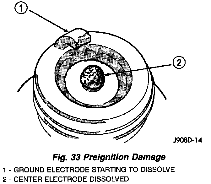 Preignition damage is usually caused by excessive combustion chamber temperature. The center electrode dissolves first and the ground electrode dissolves somewhat latter. Insulators appear relatively deposit free. Determine if the spark plug has the correct heat range rating for the engine. Determine if ignition timing is over advanced or if other operating conditions are causing engine overheating. (The heat range rating refers to the operating temperature of a particular type spark plug. Spark plugs are designed to operate within specific temperature ranges. This depends upon the thickness and length of the center electrodes porcelain insulator.)
