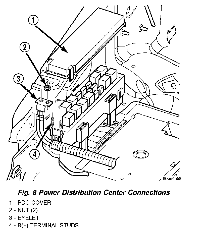 6. Remove the two nuts that secure the two-holed eyelet of the battery wire harness PDC take outs to the PDC B(+) terminal studs (Fig. 8).