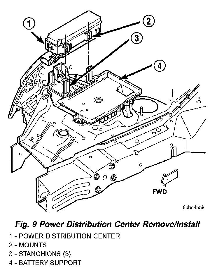8. Disengage the latches on the PDC housing mounts from the tabs on the PDC mounting stanchions of the battery support, and pull the PDC housing upward to disengage the mounts from the stanchions (Fig. 9).