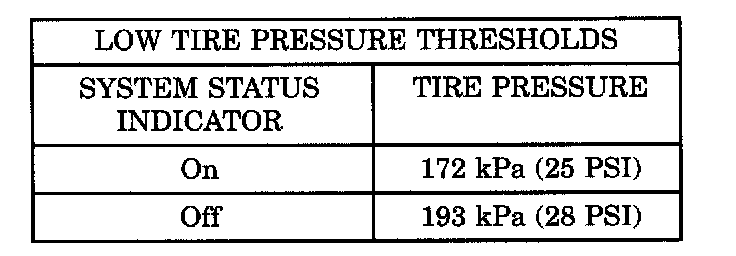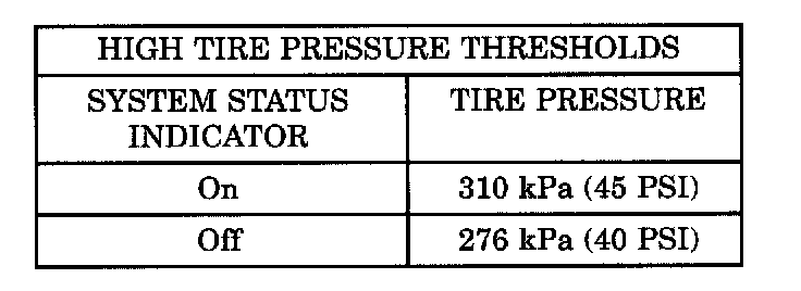 The EVIC will monitor the tire pressure signals from the five tire sensor/transmitters and determine if any tire has gone below the Low Pressure Threshold or raised above the High Pressure Threshold. Refer to the table.