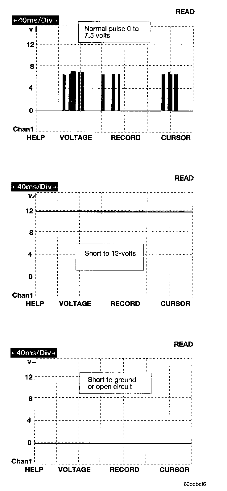 The bus messages are transmitted at a rate averaging 10800 bits per second. Since there is only voltage present when the modules transmit and the message length is only about 500 milliseconds, it is ineffective to try and measure the bus activity with a conventional voltmeter. The preferred method is to use DRB III lab scope. The 12v square wave selection on the 20-volt scale provides a good view of the bus activity. Voltage on the bus should pulse between zero and about seven and a half volts. Refer to the figure for some typical displays.