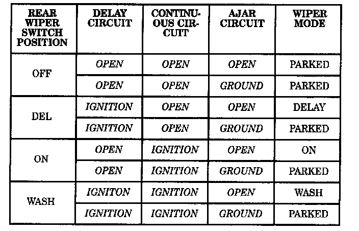 The third control circuit is the AJAR circuit. This circuit is fed by the flip-up glass ajar switch. When the flip-up glass is closed the ajar switch is open and the rear wiper module functions normally. When the flip-up glass is open, the ajar switch is closed and the circuit provides ground to the module. This ground signal indicates to the rear wiper module that it should park if operating or not allow operation if parked.