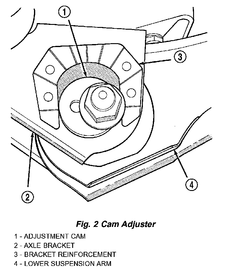 Before each alignment reading the vehicle should be jounced (rear first, then front). Grasp each bumper at the center and jounce the vehicle up and down three times. Always release the bumper in the down position. Check the caster of the front axle for correct angle. Be sure the axle is not bent or twisted. Road test the vehicle and observe the steering wheel return-to-center position. Low caster will cause poor steering wheel returnability. During the road test, turn the vehicle to both the left and right. If the steering wheel returns to the center position unassisted, the caster angle is correct. However, if steering wheel does not return toward the center position unassisted, a low caster angle is probable. Caster can be adjusted by installing cam bolts and rotating the cams on the lower suspension arm.