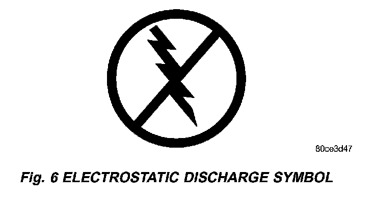 All ESD sensitive components are solid state and a symbol (Fig. 6) is used to indicate this. When handling any component with this symbol, comply with the following procedures to reduce the possibility of electrostatic charge build up on the body and inadvertent discharge into the component. If it is not known whether the part is ESD sensitive, assume that it is.