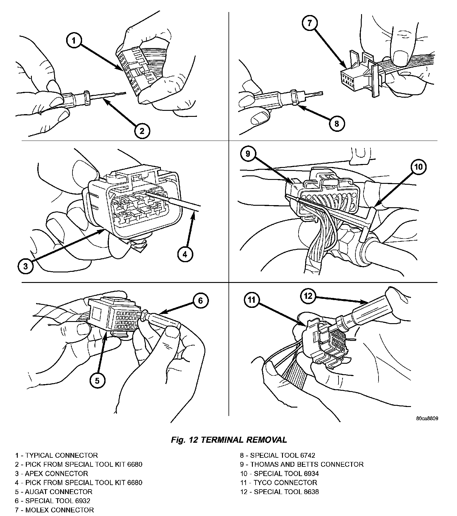 6. Position the connector locking finger away from the terminal using the proper special tool. Pull on the wire to remove the terminal from the connector (Fig. 12).