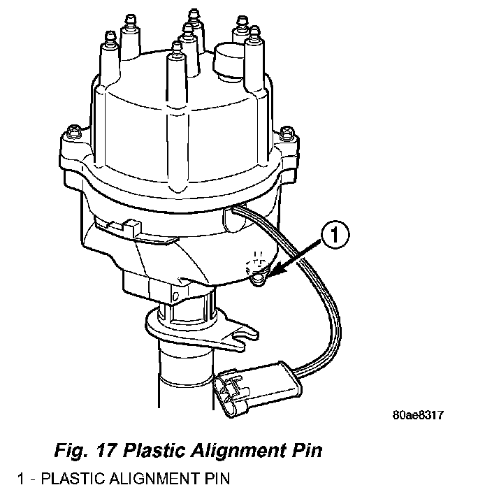 3. Factory replacement distributors are equipped with a plastic alignment pin already installed. This pin is used to temporarily hold rotor to cylinder number 1 firing position during distributor installation. If pin is in place, proceed to Step 8. If not, proceed to next step.