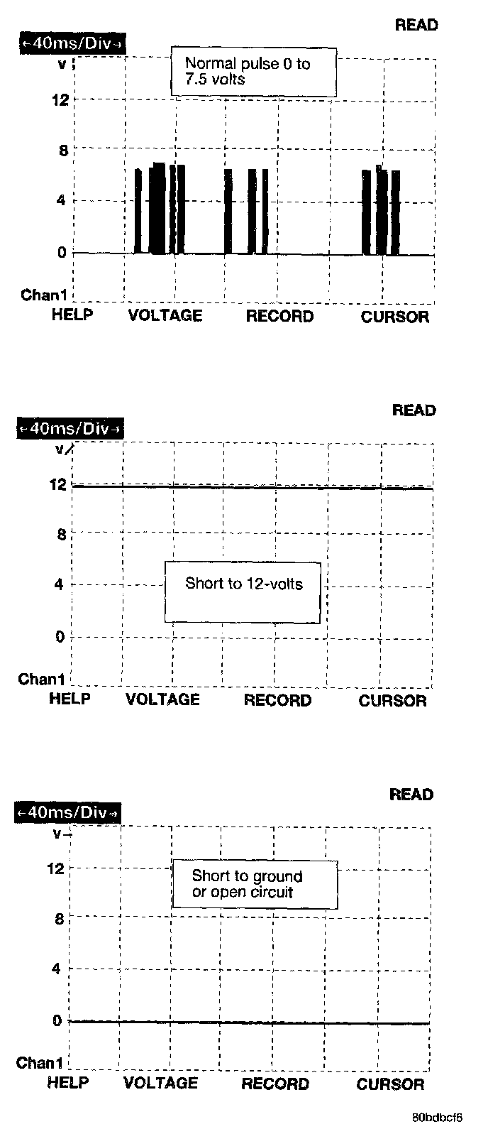 The bus messages are transmitted at a rate averaging 10800 bits per second. Since there is only voltage present when the modules transmit and the message length is only about 500 milliseconds, it is ineffective to try and measure the bus activity with a conventional voltmeter. The preferred method is to use DRBIII lab scope. The 12v square wave selection on the 20-volt scale provides a good view of the bus activity. Voltage on the bus should pulse between zero and about 7 1/2 volts. Refer to the diagram for some typical displays.