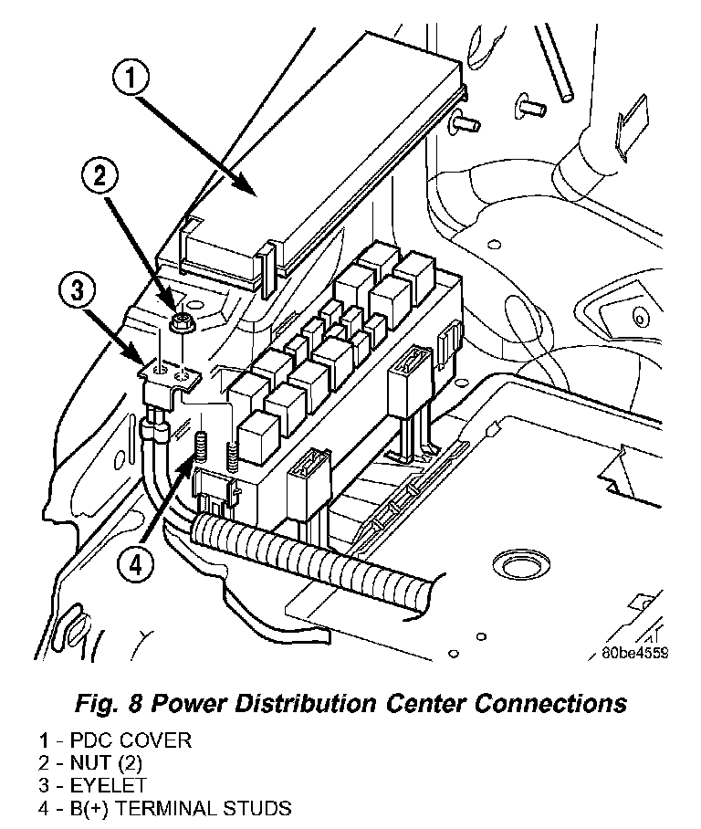 6. Remove the two nuts that secure the two-holed eyelet of the battery wire harness PDC take outs to the PDC B(+) terminal studs (Fig. 8).