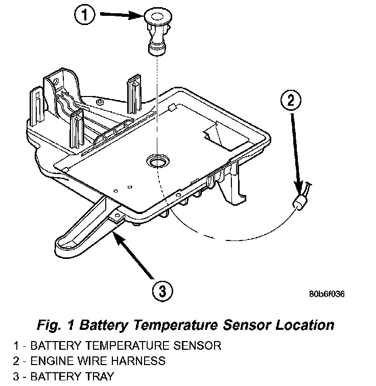 The battery temperature sensor is located under the vehicle battery (Fig. 1) and is attached to a mounting hole on the battery tray