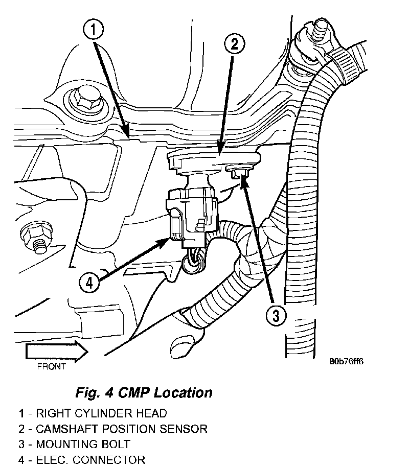 The Camshaft Position Sensor (CMP) on this engine is bolted to the front/top of the right cylinder head.