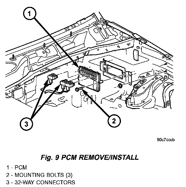 USE THE DRB SCAN TOOL TO REPROGRAM THE NEW POWERTRAIN CONTROL MODULE (PCM) WITH THE VEHICLES ORIGINAL IDENTIFICATION NUMBER (VIN) AND THE VEHICLES ORIGINAL MILEAGE. IF THIS STEP IS NOT DONE, A DIAGNOSTIC TROUBLE CODE (DTC) MAY BE SET.