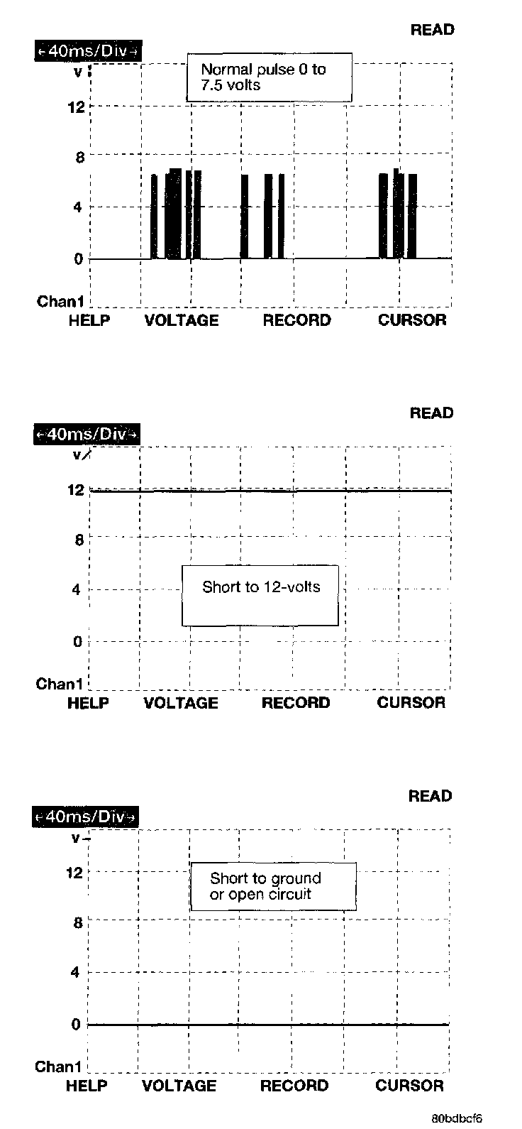 The bus messages are transmitted at a rate averaging 10800 bits per second. Since there is only voltage present when the modules transmit and the message length is only about 500 milliseconds, it is ineffective to try and measure the bus activity with a conventional voltmeter. The preferred method is to use the DRBIII lab scope. The 12v square wave selection on the 20-volt scale provides a good view of the bus activity. Voltage on the bus should pulse between zero and about 7 1/2 volts. Refer to the figure for some typical displays.
