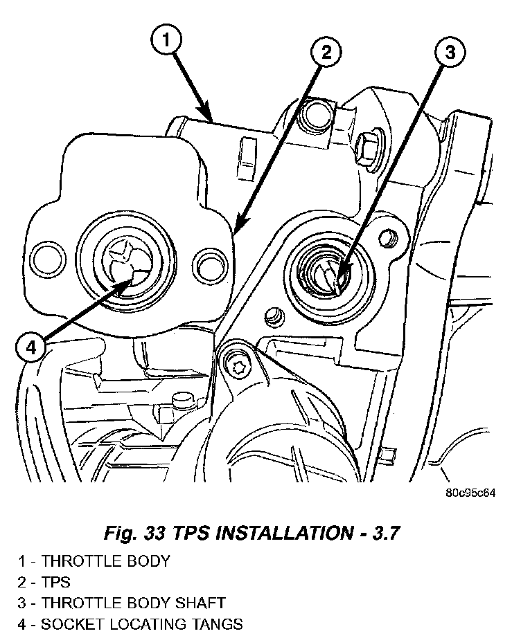 The throttle shaft end of the throttle body slides into a socket in the TPS. The TPS must be installed so that it can be rotated a few degrees. (If sensor will not rotate, install sensor with throttle shaft on other side of socket tangs). The TPS will be under slight tension when rotated.