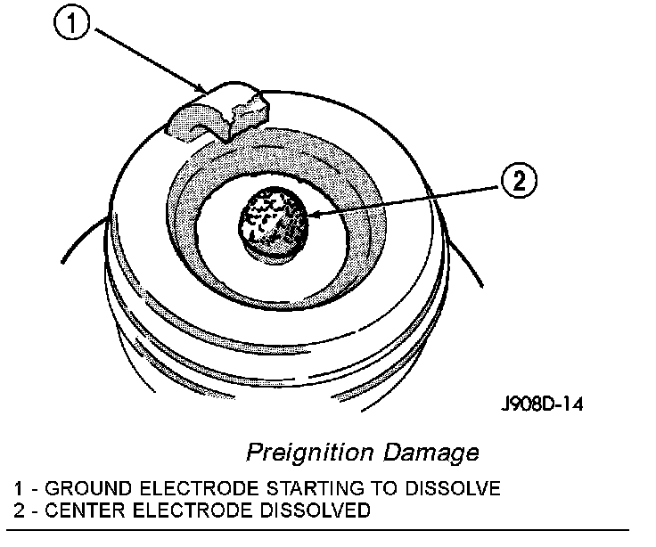 Preignition damage is usually caused by excessive combustion chamber temperature. The center electrode dissolves first and the ground electrode dis-relatively deposit free. Determine if the spark plug has the correct heat range rating for the engine. Determine if ignition timing is over advanced or if other operating conditions are causing engine overheating. (The heat range rating refers to the operating temperature of a particular type spark plug.Spark plugs are designed to operate within specific temperature ranges. This depends upon the thick-ness and length of the center electrodes porcelain insulator.)