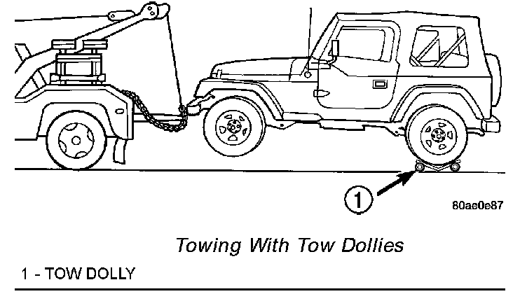 WARNING: WHEN TOWING A DISABLED VEHICLE AND THE DRIVE WHEELS ARE SECURED IN A WHEEL LIFT OR TOW DOLLIES, ENSURE THE TRANSMISSION IS IN THE PARK POSITION (AUTOMATIC TRANSMISSION) OR A FORWARD DRIVE GEAR (MANUAL TRANSMISSION).DO NOT ATTACH SLING-TYPE TOWING EQUIPMENT TO THE REAR OF A TJ.