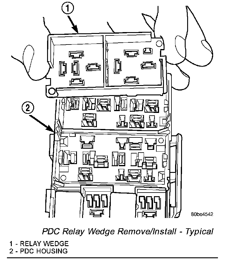 CAUTION: Proper care must be taken to be certain that the wiring and terminals from the faulty PDC relay cassette are installed in the correct terminal cavities of the replacement relay cassette. To prevent mistakes it is recommended that the wiring and terminals be removed from the faulty relay cassette one cavity at a time, repaired or spliced as necessary, then installed securely into the correct cavity of the replacement relay cassette. If you are not absolutely certain into which cavity a terminal should be installed, refer to Power and Ground Distribution Wiring Diagram Index for the location of complete PDC wiring diagrams.