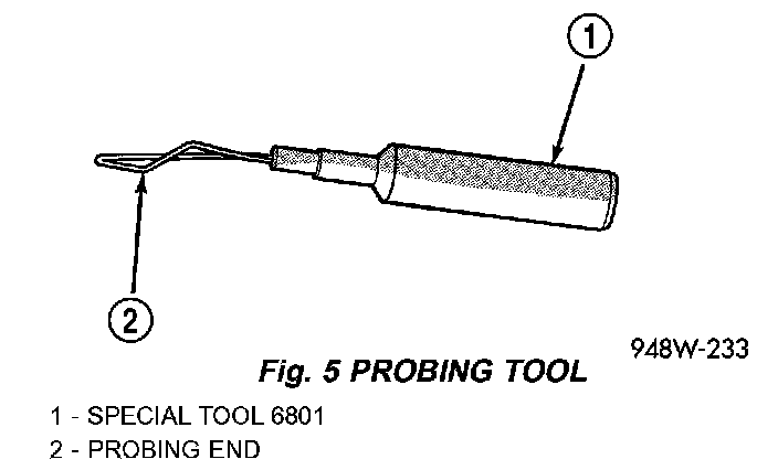 - Probing Tools - These tools are used for probing terminals in connectors (Fig. 5). Select the proper size tool from Special Tool Package 6807, and insert it into the terminal being tested. Use the other end of the tool to insert the meter probe.