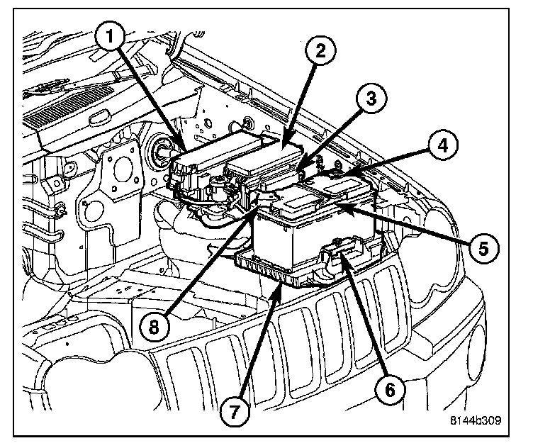 The Front Control Module (FCM) (3) is a micro controller based module located in the left front corner of the engine compartment. The FCM mates directly to the Integrated Power Module (IPM)(2). The IPM connects directly to the battery and provides the primary means of circuit protection and power distribution for many of the vehicle electrical systems. The FCM controls power to some of these vehicle systems electrical and electromechanical loads based on inputs received from hard wired switch inputs and data received on the Controller Area Network (CAN) data bus circuit.