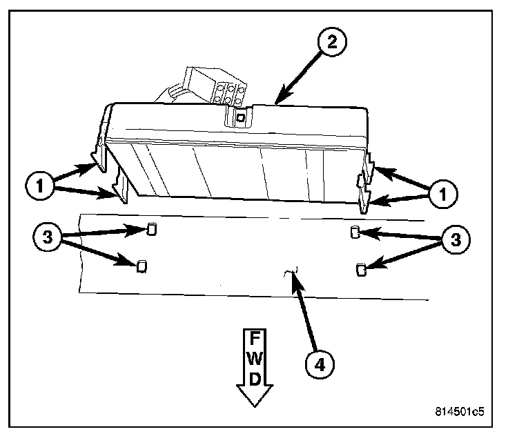 2. Position the retaining clips (1) with the retaining holes (3) in the mounting bracket (4). Firmly apply even pressure to the module (2) until all four retaining clips (1) snap into place.