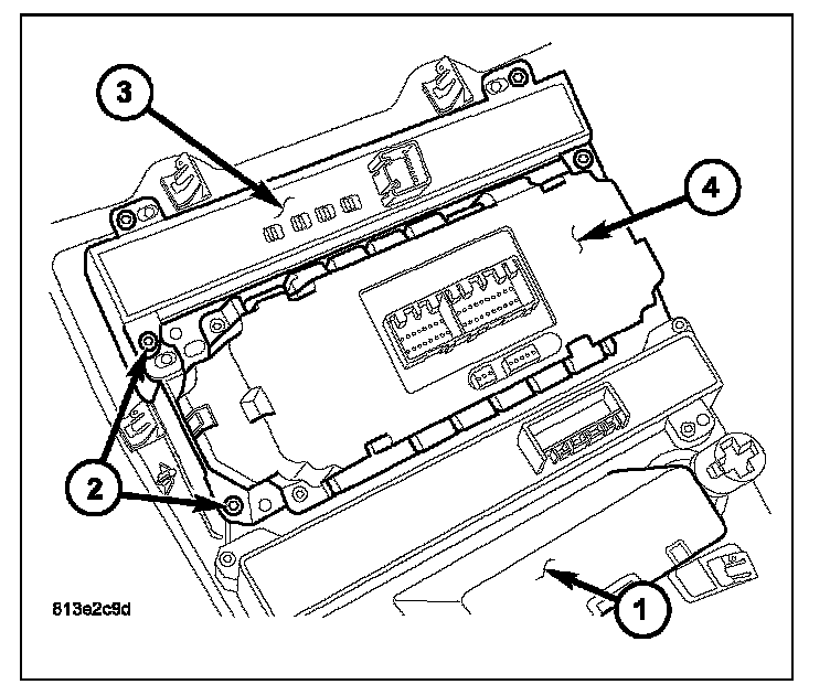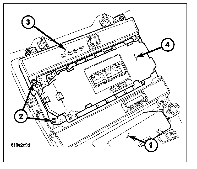 3. Remove the screws (2) that secure the electronic vehicle information center (EVIC) control (3) and the A/C-heater control (4) to the center bezel and remove the controls.