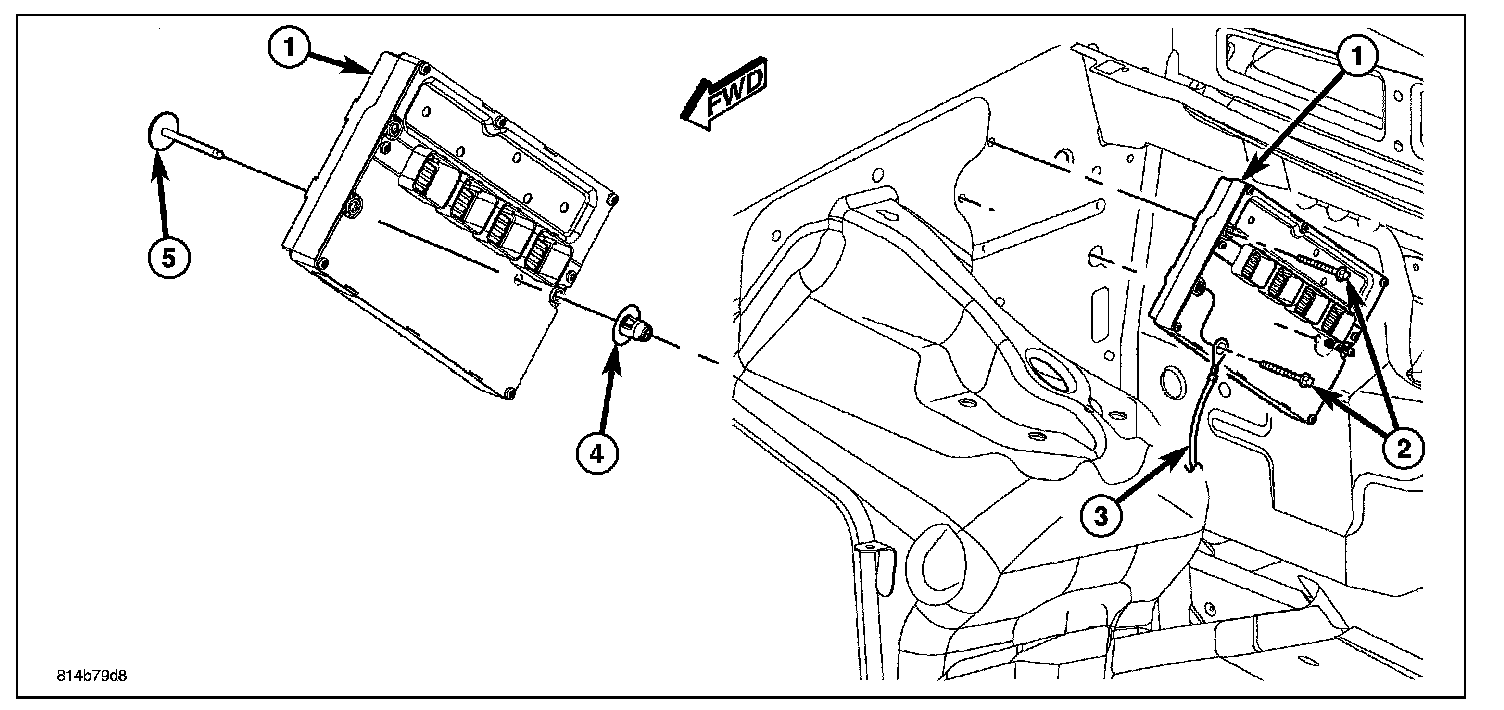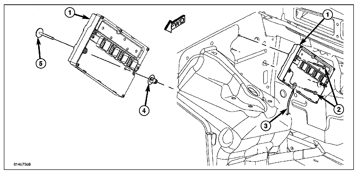 3. A locating pin (5) is used in place of one of the PCM mounting bolts. Pry clip (4) from pin (5).