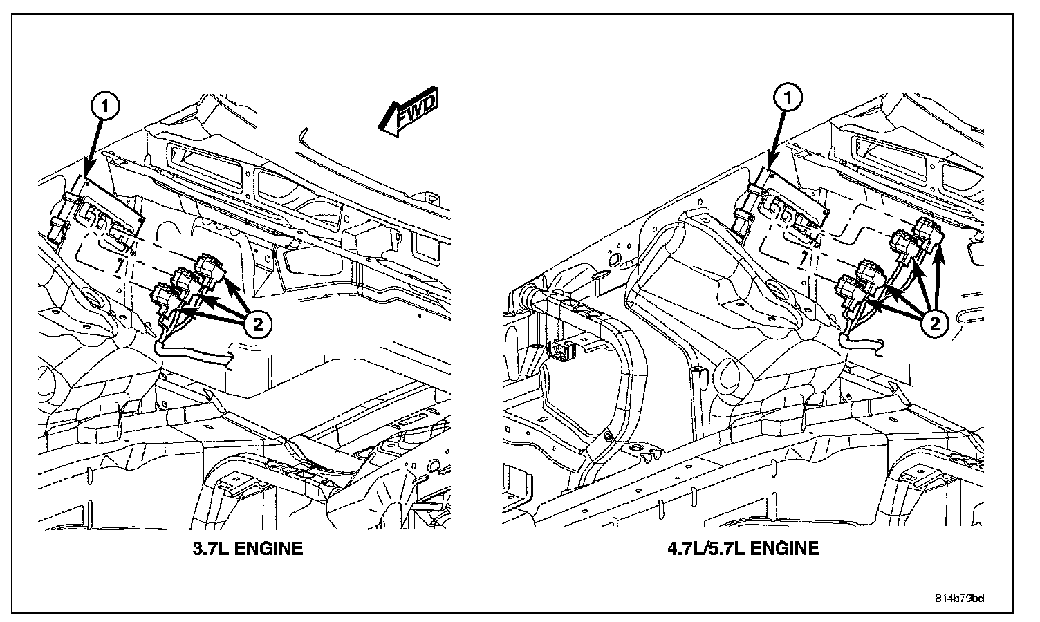 The PCM (1) is attached to the right-front inner fender located in the engine compartment.