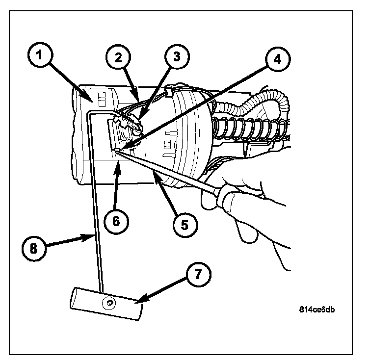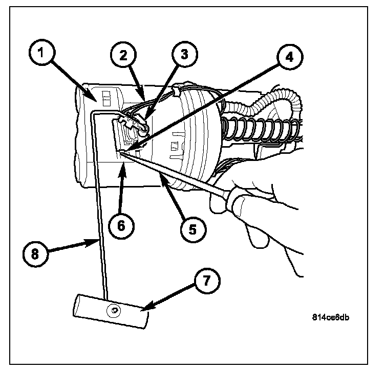 3. To remove sending unit from pump module, use a small pick (5) or screwdriver. Lift on plastic locking tab (4) while sliding sending unit (3) down the mounting tracks (6).