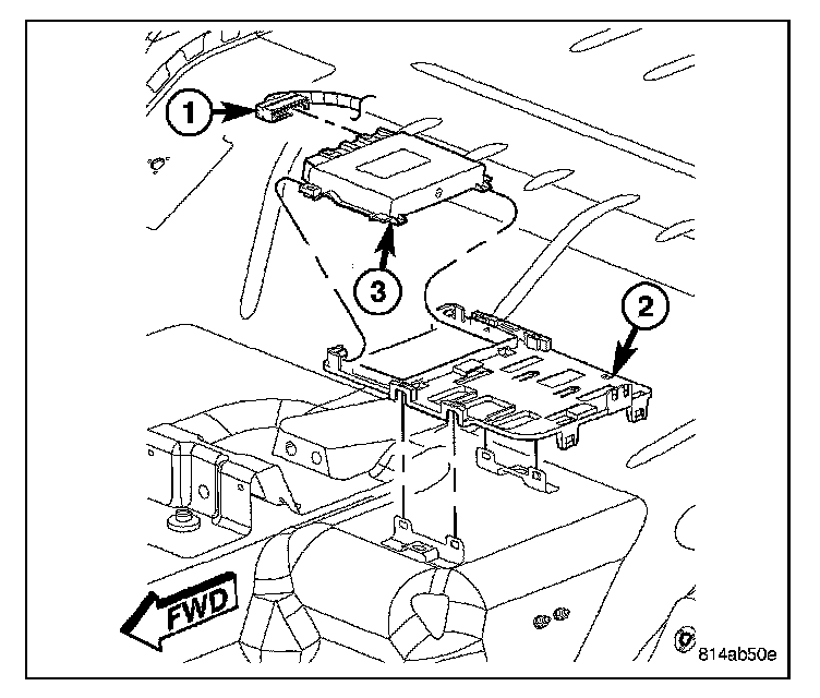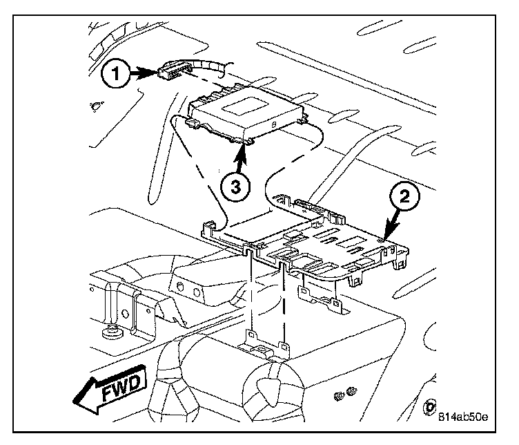 4. Using a trim stick (special tool #C-4755) or equivalent, gently pry back on the retaining tabs on the mounting plate (2) and remove module.