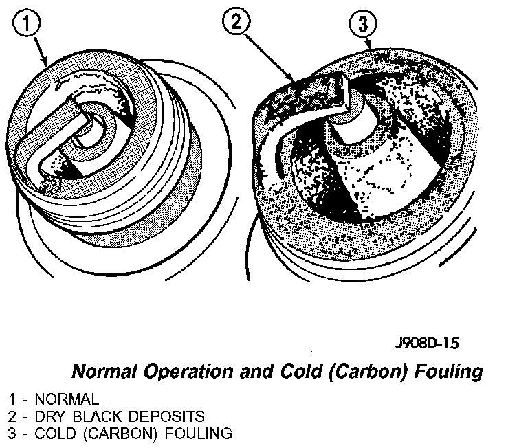 Cold fouling is sometimes referred to as carbon fouling. The deposits that cause cold fouling are basically carbon. A dry, black deposit on one two plugs in a set may be caused by sticking valves or defective spark plug cables. Cold (carbon) fouling of the entire set of spark plugs may be caused by clogged air cleaner element or repeated short operating times (short trips).