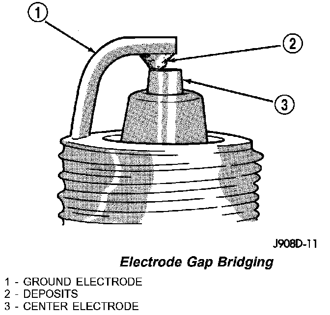 Electrode gap bridging may be traced to loose deposits in the combustion chamber. These deposits accumulate on the spark plugs during continuous stop-and-go driving. When the engine is suddenly subjected to a high torque load, deposits partially liquefy and bridge the gap between electrodes. This short circuits the electrodes. Spark plugs with electrode gap bridging can be cleaned using standard