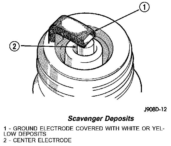 Fuel scavenger deposits may be either white or yellow. They may appear to be harmful, but this is a normal condition caused by chemical additives in certain fuels. These additives are designed to change the chemical nature of deposits and decrease spark plug misfire tendencies. Notice that accumulation on the ground electrode and shell area may be heavy, but the deposits are easily removed. Spark plugs with scavenger deposits can be considered normal in condition and can be cleaned using standard procedures.