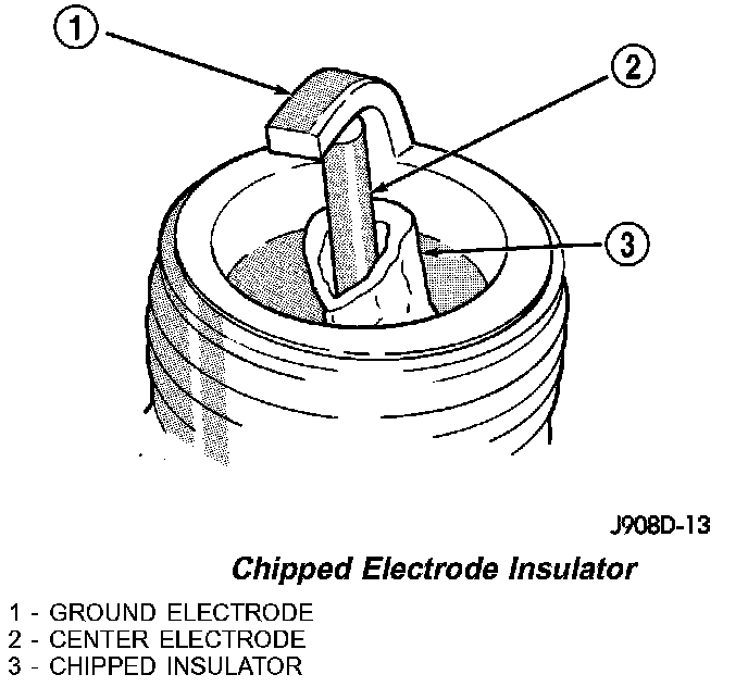 A chipped electrode insulator usually results from bending the center electrode while adjusting the spark plug electrode gap. Under certain conditions, severe detonation can also separate the insulator from the center electrode. Spark plugs with