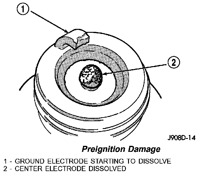 Preignition damage is usually caused by excessive combustion chamber temperature. The center electrode dissolves first and the ground electrode dissolves somewhat latter. Insulators appear relatively deposit free. Determine if the spark plug has the correct heat range rating for the engine. Determine if ignition timing is over advanced or if other operating conditions are causing engine overheating. (The heat range rating refers to the operating temperature of a particular type spark plug. Spark plugs are designed to operate within specific temperature ranges. This depends upon the thickness and length of the center electrodes porcelain insulator.