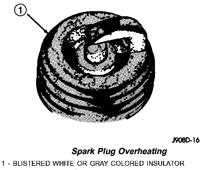 Overheating is indicated by a white or gray center electrode insulator that also appears blistered. The increase in electrode gap will be considerably in excess of 0.001 inch per 2000 miles of operation. This suggests that a plug with a cooler heat range rating should be used. Over advanced ignition timing, detonation and cooling system malfunctions can also cause spark plug overheating.