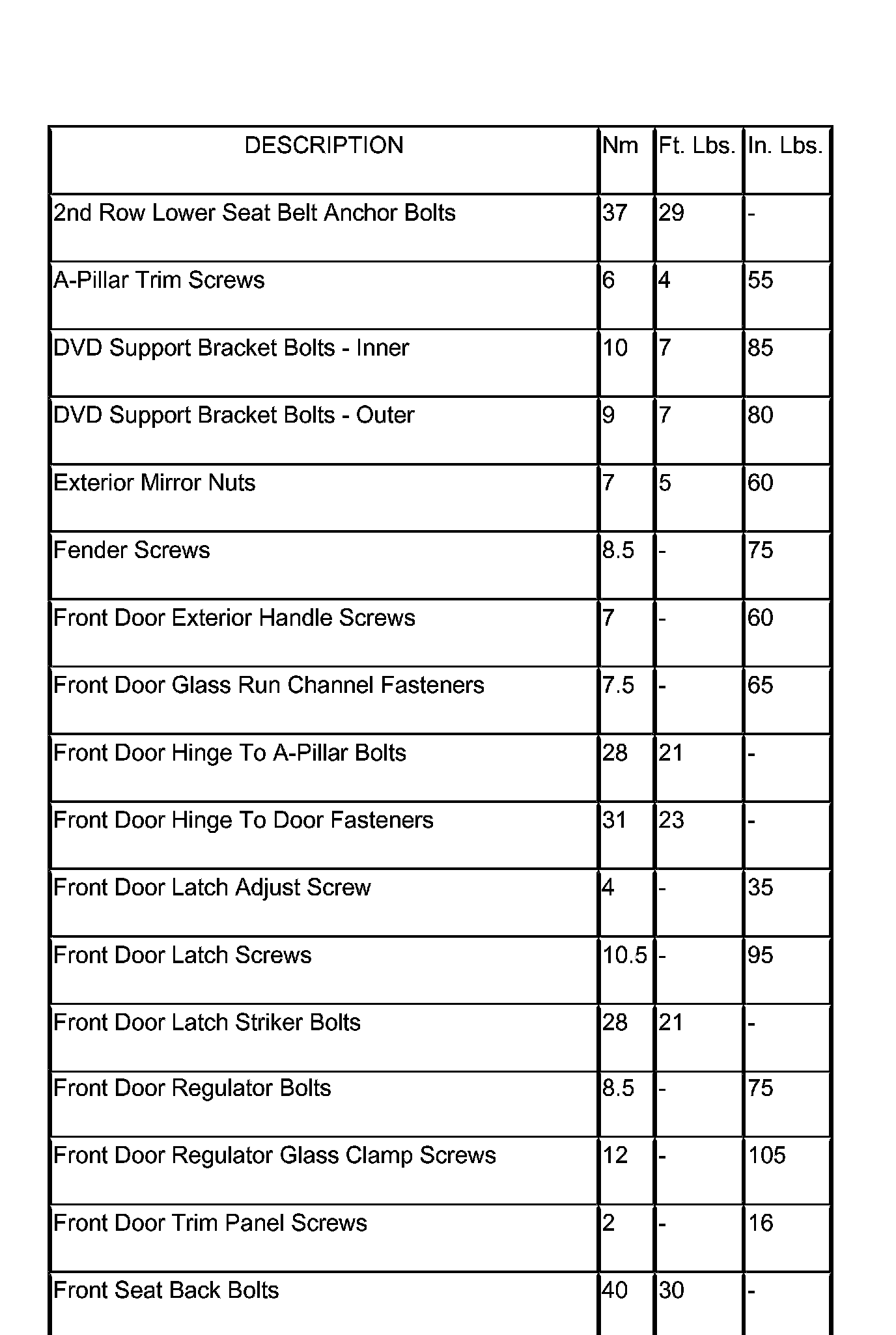 SPECIFICATIONS - TORQUE