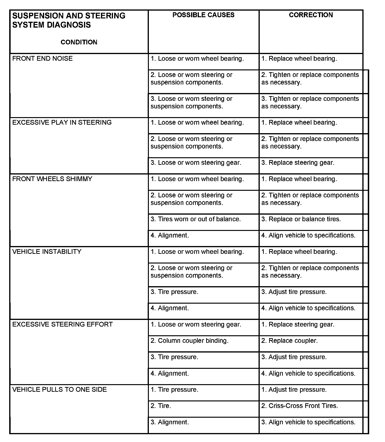 Before starting wheel alignment, the following inspection and necessary corrections must be completed. Refer to Suspension and Steering System Diagnosis Chart below.