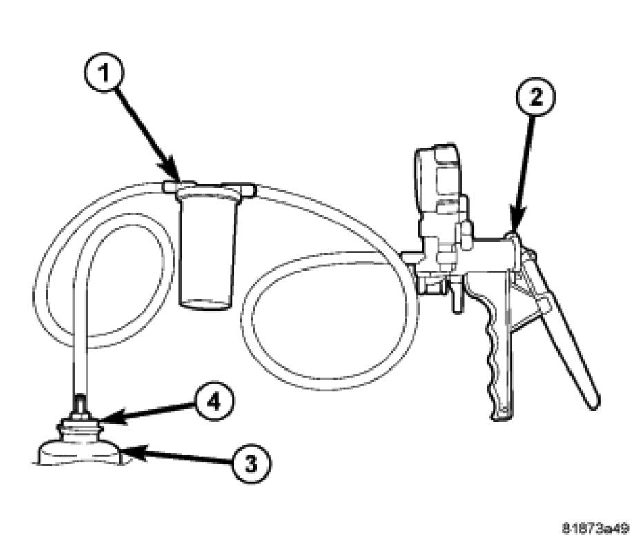 CAUTION: Failure to use a the vacuum pump reservoir (1) may allow power steering fluid to be sucked into the hand vacuum pump.