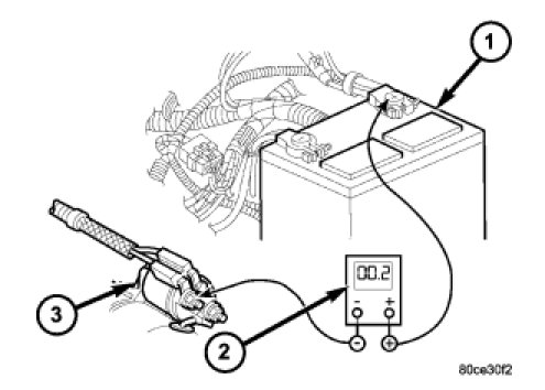 12. If equipped with dual battery system (certain diesel equipped models), connect positive lead of voltmeter to positive battery cable clamp on battery located on left side of vehicle. Connect negative lead of voltmeter to positive battery terminal post on battery located on right side of vehicle. Rotate and hold ignition switch in Start position. Observe voltmeter. If reading is above 0.2 volt, clean and tighten battery cables at both batteries. Repeat test. If reading is still above 0.2 volt, replace faulty positive battery cable.