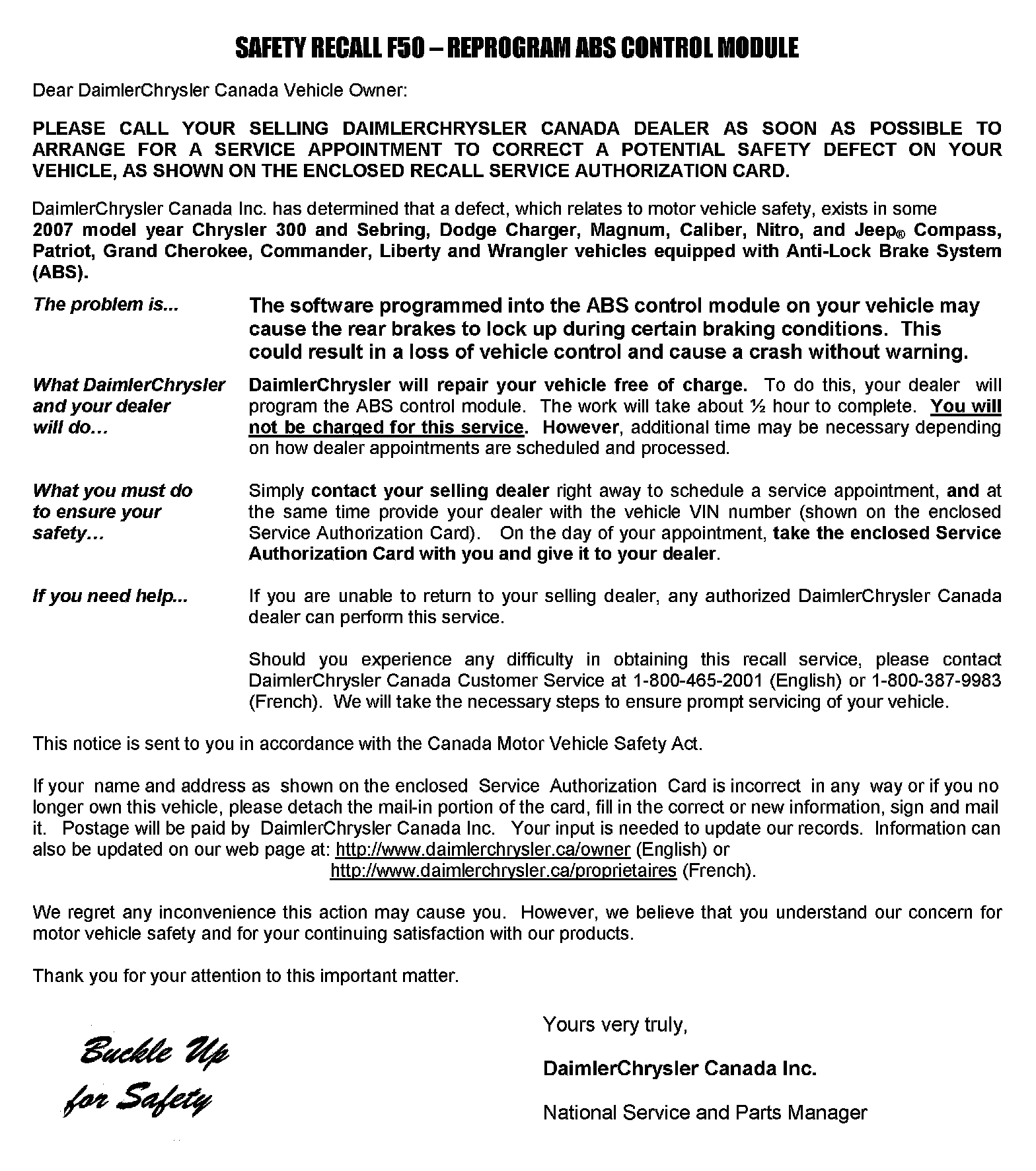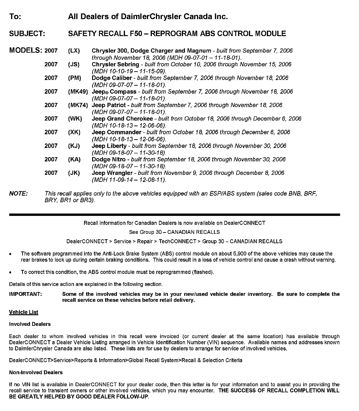Home >> Jeep >> 2007 >> Wrangler V6-3.8L >> Repair and Diagnosis >> Technical Service Bulletins >> All Technical Service Bulletins >> Canada - Recall - F50 Reprogram ABS Control Module